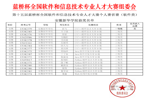 本网讯(通讯员:袁书萍)近日,第十五届蓝桥杯全国软件和信息技术专业人才大赛个人赛省赛在全国31个省市自治区举办。来自北京大学、清华大学、复旦大学、上海交通大学等1900多所高校的23万名选手同台竞技,在C/C++、JAVA、Python、软件测试、单片机、嵌入式、物联网、EDA等八大竞赛科目中进行了激烈比拼,呈现了一场高标准、高质量、高水平的精彩赛事。我校学子与全国各大高校学生同台竞技,所有参赛选手均获奖项,我校大数据与人工智能学院荣获省赛一等奖1项,二等奖5项,三等奖11项,荣获佳绩。