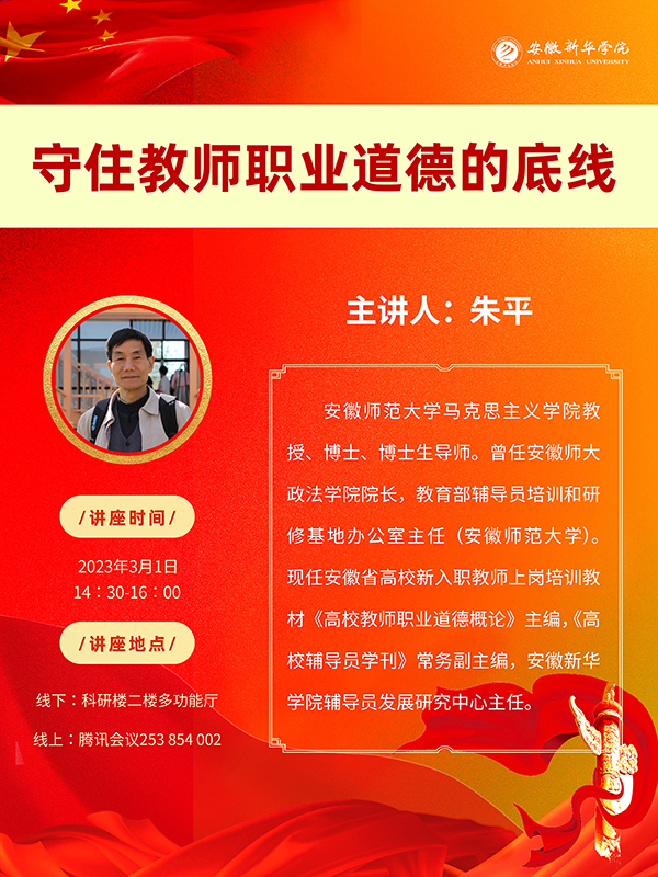 专家简介:朱平,安徽师范大学马克思主义学院教授、博士、博士生导师。曾任安徽师大政法学院院长,教育部辅导员培训和研修基地办公室主任(安徽师范大学)。现任安徽省高校新入职教师上岗培训教材《高校教师职业道德概论》主编,《高校辅导员学刊》常务副主编,milan米兰官网辅导员发展研究中心主任。