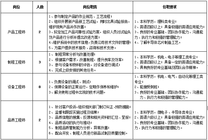 3、其他待遇:上市企业,管理规范;提供工作餐、住宿及班车接送;生活娱乐设施配套齐全:篮球场、羽毛球馆、乒乓球室,足球场等;芯片产业链高科技企业,就业前景广阔。