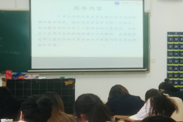 二重积分的概念和计算是高等数学多元函数积分学的重要部分,理解二重积分的概念,熟练掌握二重积分的计算是教学的重点也是难点。如何学好二重积分及计算方法,是学生学习多元函数积分学首先要面对的问题,计算二重积分的基本思路是能积、易积的积分计算思想。常规二重积分的计算方法往往比较繁琐,其一般步骤为:第一,画出积分区域草图;第二,选择适当的坐标系;第三,确定积分区域的次序并写出积分区域的不等式组;第四,利用公式化二重积分为二次积分然后进行计算。本次学术报告,马艳丽老师新增了四种计算二重积分的方法,讲述了每种方法的求解思路,并列举典型的实例,便于学生更好地理解和掌握这些方法,达到事半功倍、举一反三的学习效果。