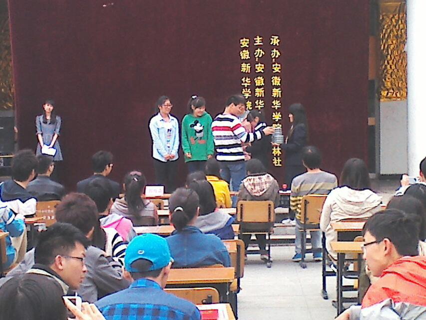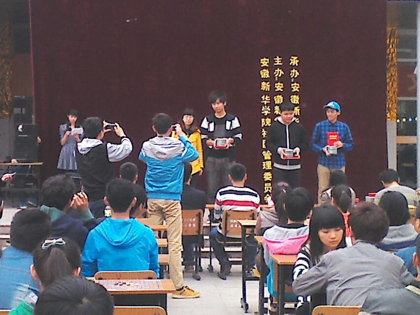 (本网讯 王军)2014年4月20日,在公共课教学部王军老师的指导下,“棋林社”承办了安徽省第三届“棋心愉悦杯”五子棋比赛。本次活动比赛时间持续10天,并于最后两天进行了总决赛。活动期间,特别邀请了全国著名女棋手吴志琴、安徽五子棋冠军王友志、“棋心愉悦”组织创始人郭海森以及全国大学生五子棋男、女冠军吴国强和王新慧进行现场指导,并于决赛后担任颁奖嘉宾。