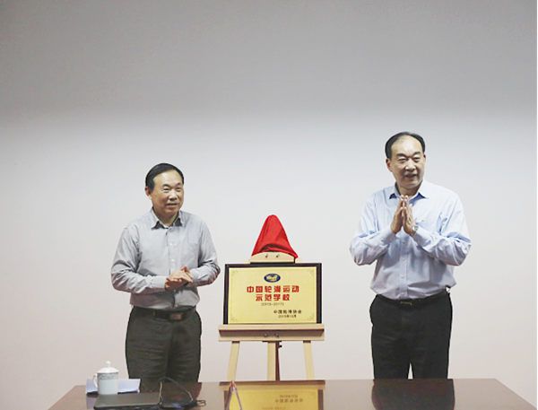 本网讯(通讯员:王军,摄影:陆如海)2015年11月,经省体育局和轮滑协会的推荐,我校正式被中国轮滑协会评为“中国轮滑运动示范学校”,有效期为2015年至2017年。4月13日,我校“中国轮滑运动示范学校”揭牌仪式隆重举行,安徽省体育局社会体育指导中心书记王勇、副校长杨世国共同揭牌。安徽省体育局社会体育指导中心副主任王峰、公共课教学部主任王士赵、体育教研室副主任王军和公共课教学部体育教研室全体教师参与了揭牌仪式。揭牌仪式由王士赵主持。