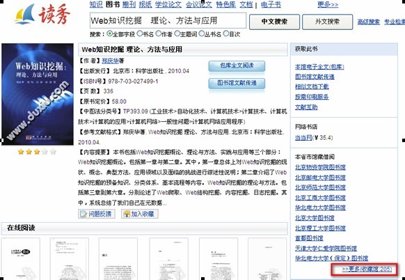 5.读秀图书检索页和卡片页增加收藏馆显示,点击数量链接即可查看