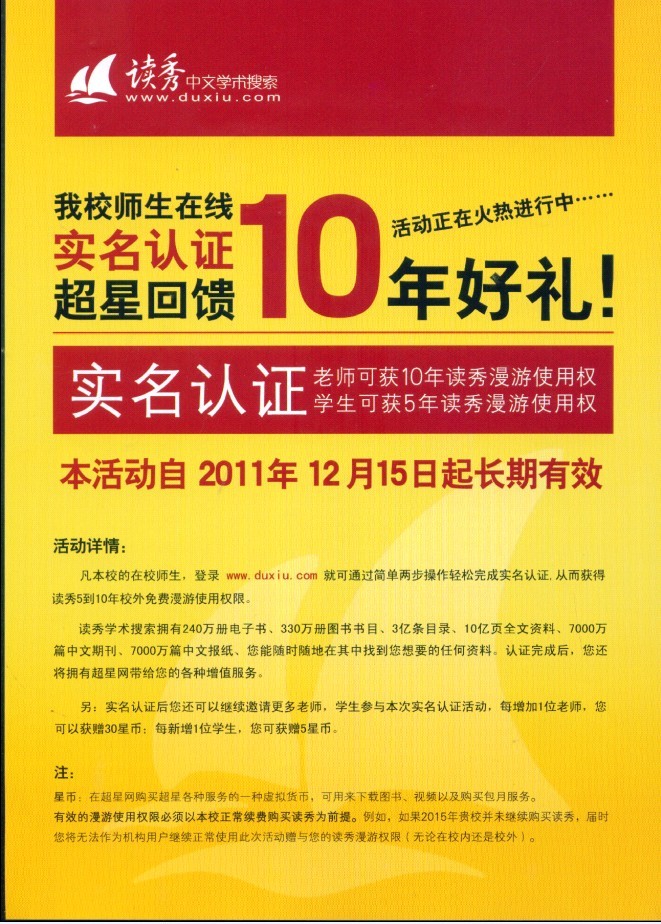 各位读者,从2011年12月9号开始,可使用"我的图书馆"账号登录读秀,新用户请在学校ip内注册,注册登录完成后请点此验证,已有账号的同学请在学校ip内登录后点此验证使用方法:在读秀登录页面点击"寒假账号登录"链接,先登录"我的图书馆",然后从我的图书馆首页左上角的链接进入读秀。
