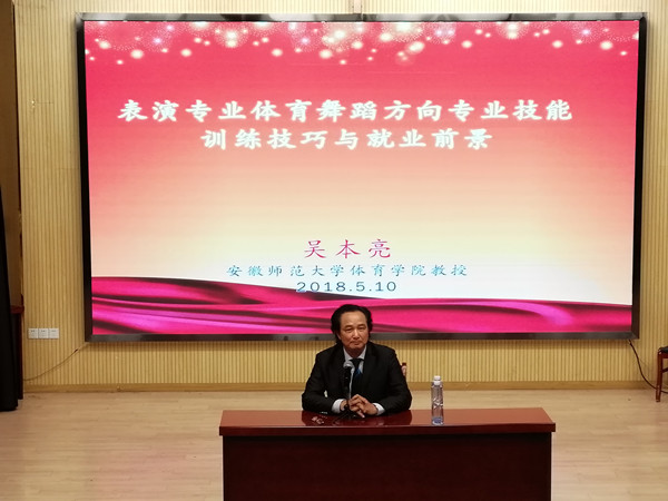 本网讯(通讯员:闫井明)5月10日,文化与新闻传播学院邀请安徽师范大学体育学院吴本亮教授举办“表演专业体育舞蹈方向专业技能训练与就业前景”专题讲座。2017级表演(体育舞蹈)专业全体师生聆听了本场讲座。