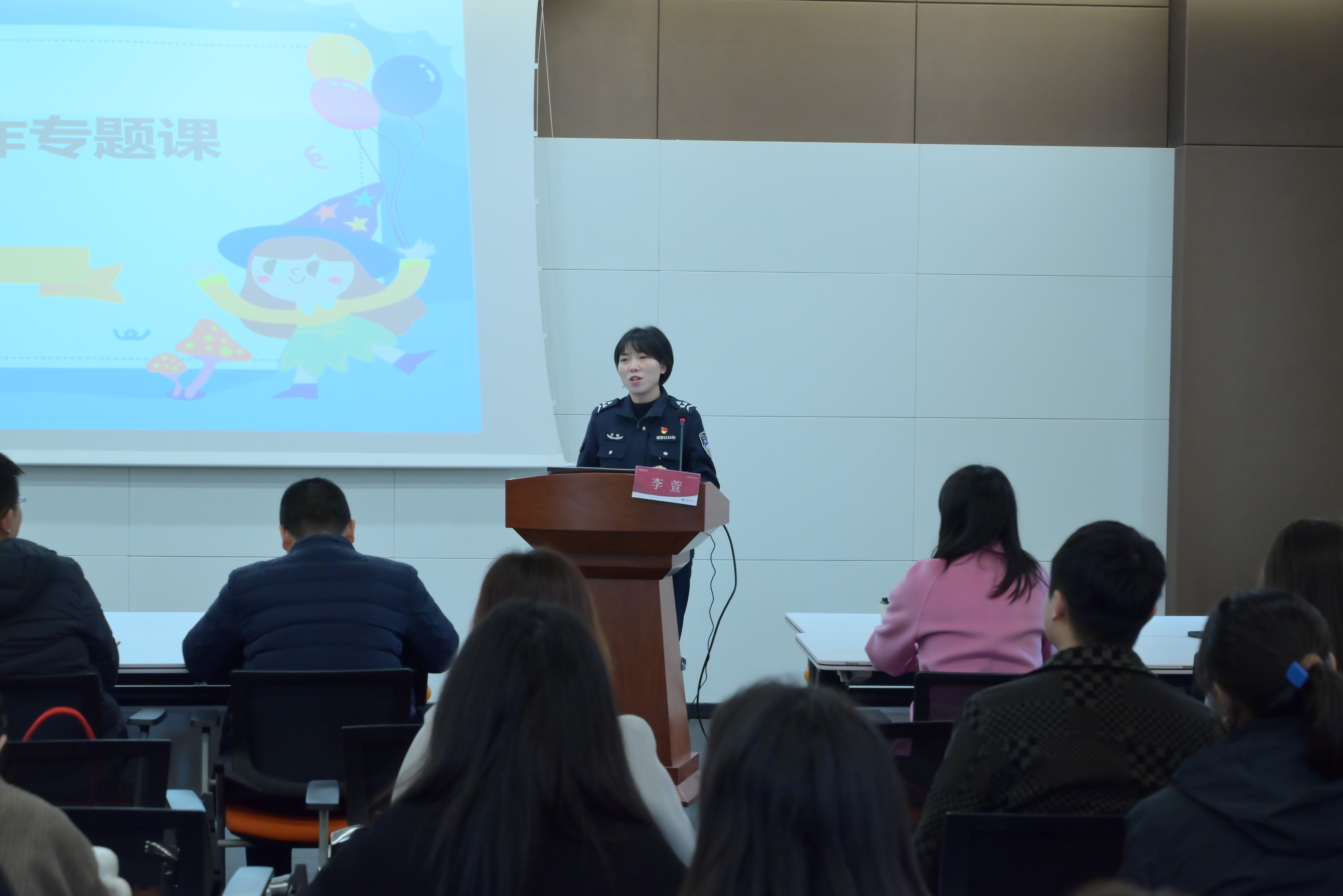 随后,合肥市高新区派出所宣传员李萱作《大学校园反诈专题课》内容培训,她以自身从警多年的工作经验和一个个触目惊心的真实诈骗案件讲解分析了形式多样的电信诈骗,并着重总结强调了近年来大学校园常见的诈骗方式及如何树立防诈意识远离骗局。
