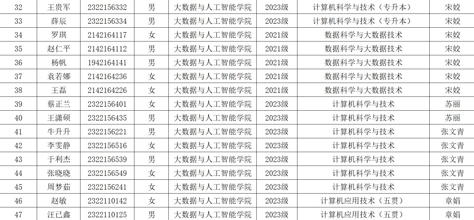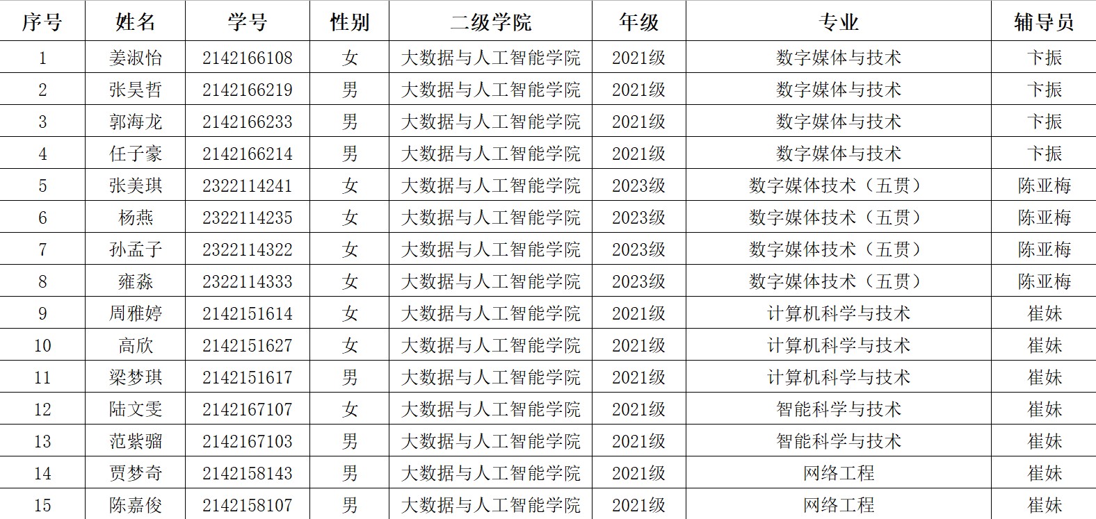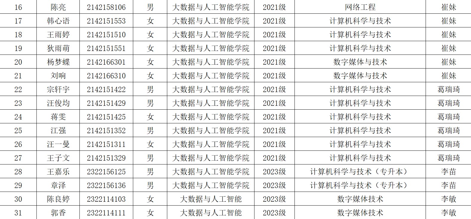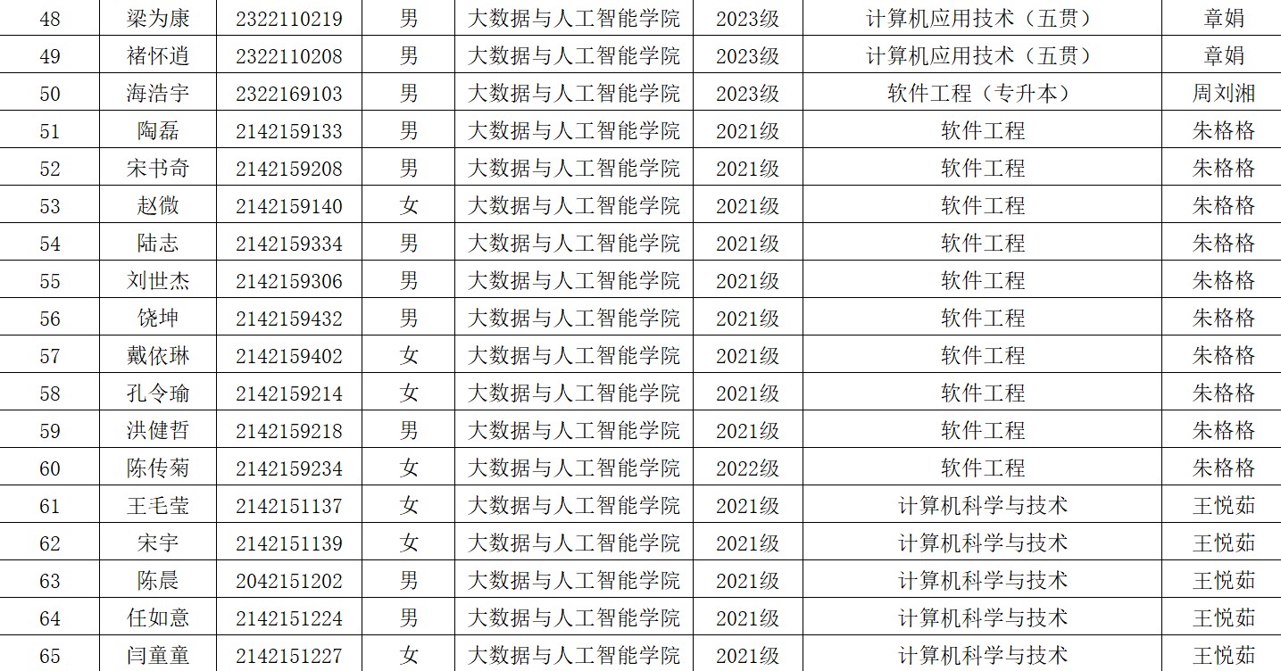 各班级: 现将2025年milan米兰官网大数据与人工智能学院校级优秀毕业生名单公示如下: