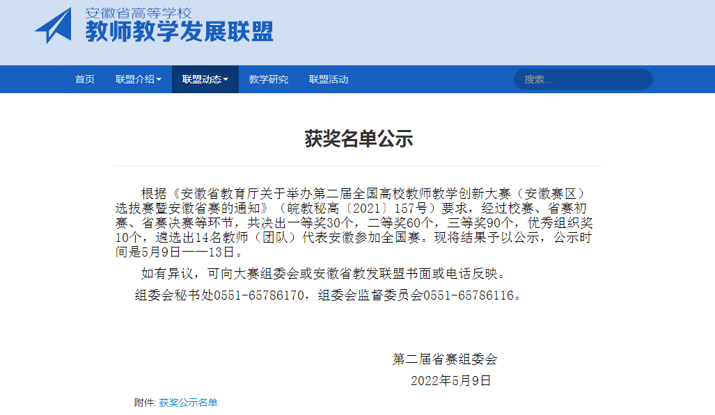 本网讯(通讯员:程茜)5月8日,由安徽省教育厅主办、安徽农业大学承办的第二届全国高校教师教学创新大赛安徽赛区选拔赛暨安徽省赛圆满收官。经过激烈角逐,我校推荐参赛的8个教师团队中,5个团队斩获奖项,取得1个一等奖、4个二等奖的好成绩!创造了我校教师在教师教学创新大赛上的新突破!