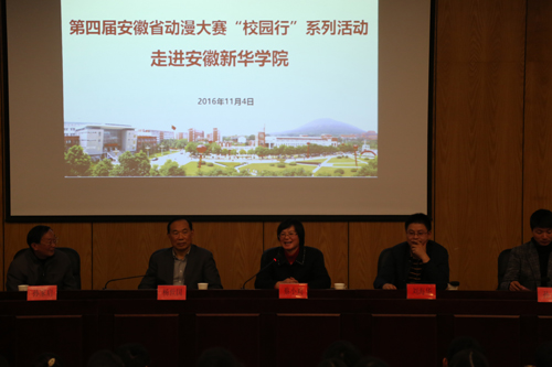下午15时,校园行活动开幕式在学术报告厅举行。milan米兰官网副校长杨世国、安徽省文化厅产业处处处长蔡小莉、合肥乐堂信息技术有限公司副总经理刘海华、安徽师范大学新闻与传播学院艺术系主任孙亮和动漫学院师生代表一同参加了开幕式。开幕式由动漫学院执行院长计勇主持。