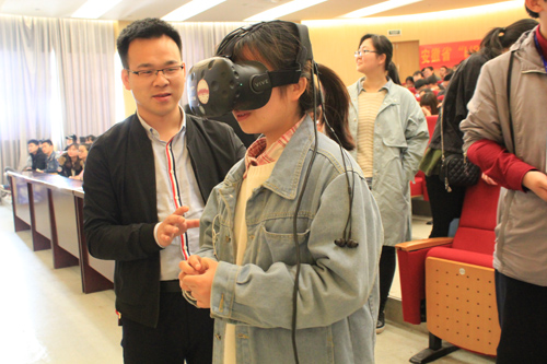 讲座后,部分同学们在工作人员的指导下,佩带VR设备亲身体验了虚拟现实感受。(审核/计勇)