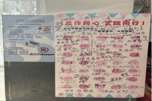 3 月 3 日,学院全体学生自发参与了 “反诈同心,艺院同行” 签名活动。活动现场,同学们有序排队,在签名板上郑重签下自己的名字,展现出防范电信诈骗的坚定决心。同时,学院利用 LED 屏幕滚动播放反诈宣传标语,让反诈信息融入学生的日常学习生活。