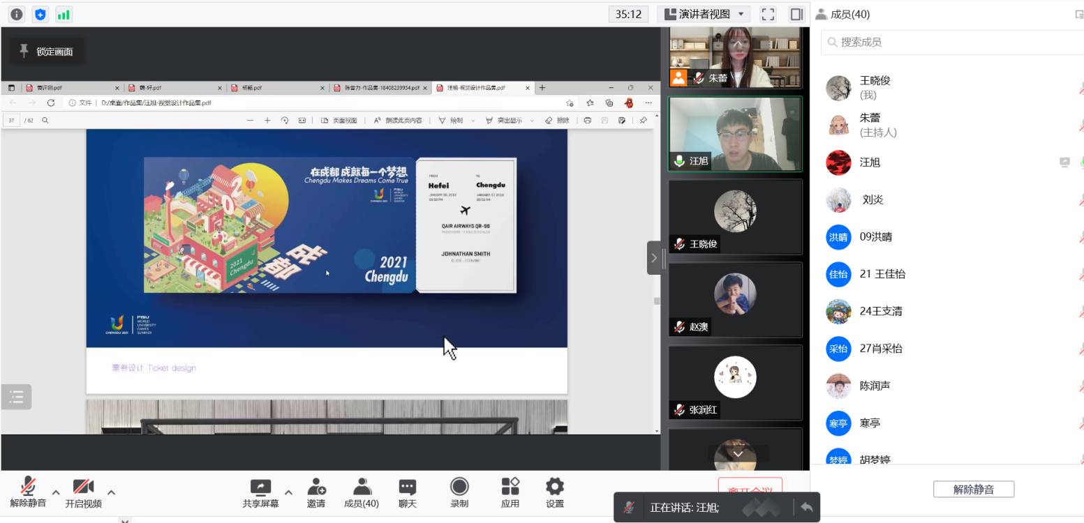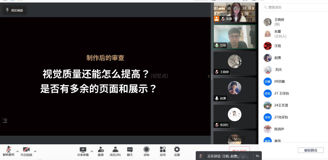 讲座中,汪旭老师结合视觉传达现行的就业形式与政策,从“制作前的考虑”、“制作时的思考”与“制作后的审查”对作品集进行解构与重塑,总结出品牌项目要从竞品视觉分析、品牌关键词分析、色彩搭配方案及原则、图标与辅助图形定义、用户风格偏好研究、视觉demo进行展示。最后,汪老师通过对作品集的核心价值、视觉质量、视觉衔接与视觉包装等进行详细介绍,引导学生开拓设计思维,提高创新能力。