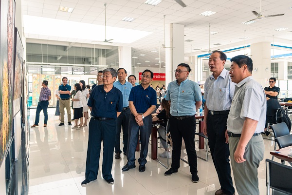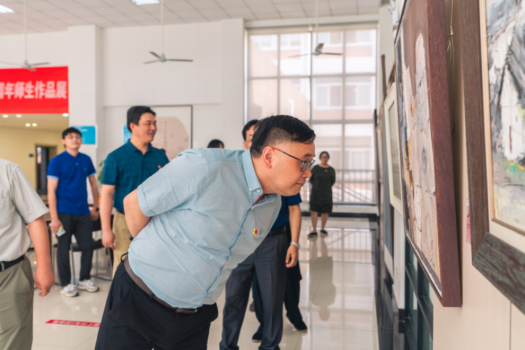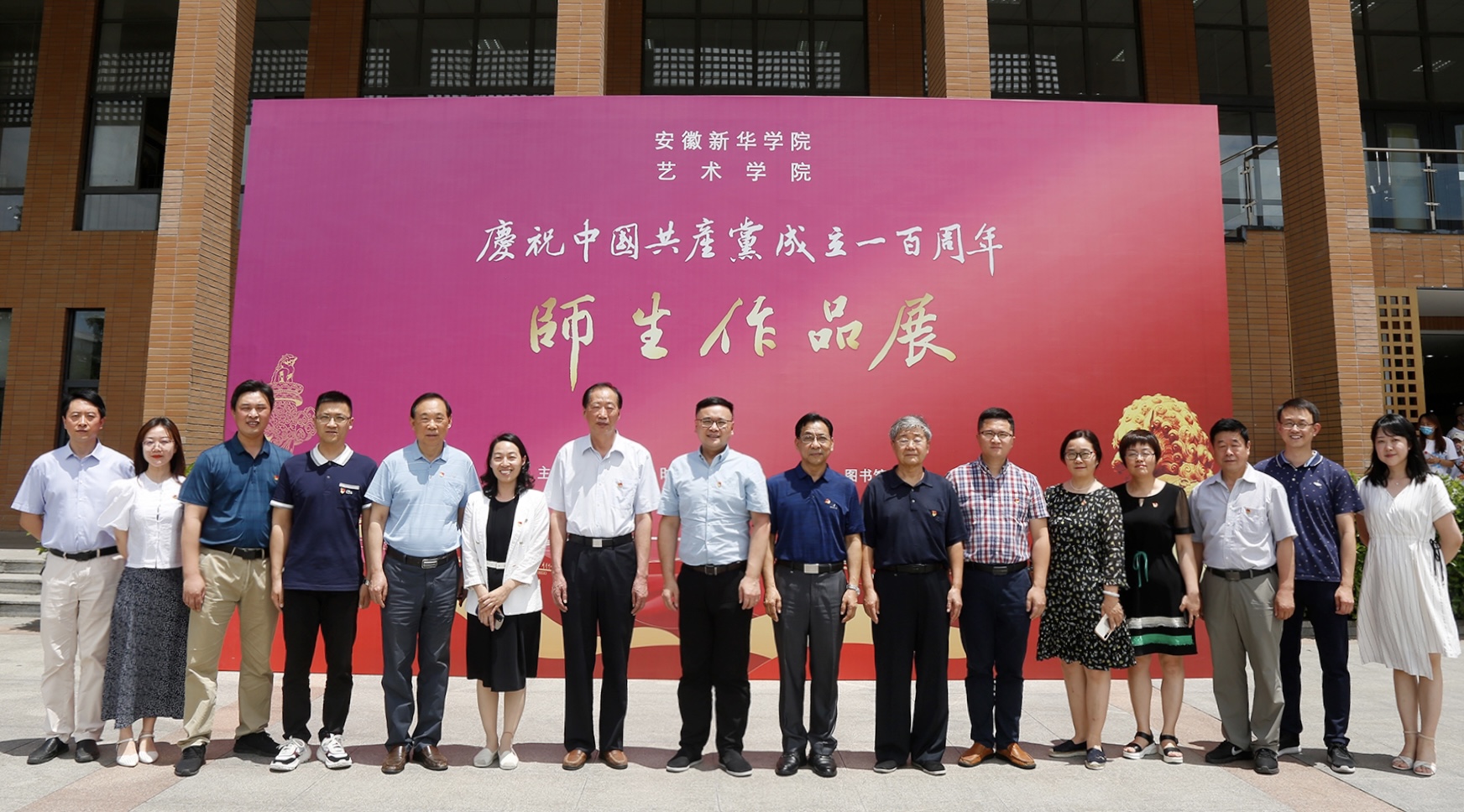 本网讯(通讯员:彭智 摄影:翟漱文、赵由由、金政)为庆祝中国共产党成立100周年活动,向党的生日献礼,艺术学院经认真策划与组织,师生积极创作,于6月18日在校图书馆二楼举办“庆祝中国共产党成立100周年师生作品展”。6月21日上午,校董事长王孝武、执行董事长储国定、党委书记邸建伟、常务副校长王丽、副校长杨世国、高级顾问胡昭林、副校长贺行佳、校长助理王琦进、校长助理盛晓青、校长助理邵玲一行前往参观与指导。