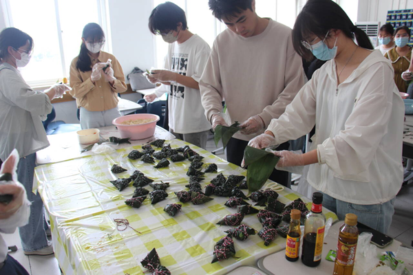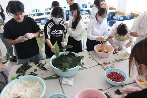活动现场,食堂工作人员早早准备好了糯米、粽叶、红枣、五花肉等丰富食材,浓郁的粽香气息弥漫开来,为活动增添了几分节日的喜庆。学生会成员们围坐在一起,跃跃欲试。虽然不少同学是第一次包粽子,手法略显生疏,但热情丝毫不减。经验丰富的“小老师”们耐心地向大家讲解包粽子的技巧:如何将粽叶卷成漏斗状、如何填放馅料、怎样捆扎紧实……大家认真学习,相互交流,互帮互助,现场氛围热烈融洽。随着时间推移,一个个形态各异的粽子在同学们手中诞生。有的棱角分明,有的圆润可爱,虽然这些粽子模样不同,但都饱含着大家对传统文化的热爱与传承。包粽子过程中,大家还分享着各自家乡的端午习俗,交流着对传统文化的理解,欢声笑语不断。粽子包好后,工作人员将它们统一蒸煮。等待的过程中,大家围坐畅谈,分享着在学生会工作的心得与收获,共同展望未来的工作计划。热气腾腾的粽子出锅后,同学们品尝着自己亲手制作的成果,脸上洋溢着满足与自豪的笑容。